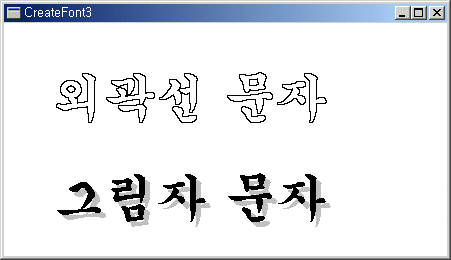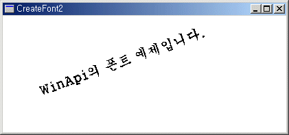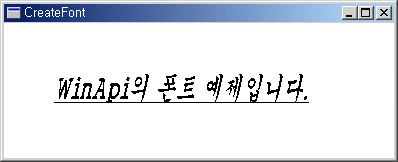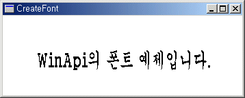 CreateFont·Î ÆùÆ®¸¦ »ý¼ºÇϰí SelectObject ÇÔ¼ö·Î ÆùÆ®¸¦ ¼±ÅÃÇÑ ÈÄ ¹®ÀÚ¿À» Ãâ·ÂÇÏ¿´´Ù. ÆùÆ®´Â »ç¿ëÇÑ ÈÄ¿¡ ¹Ýµå½Ã DeleteObject ÇÔ¼ö·Î »èÁ¦ÇØ ÁÖ¾î¾ß ÇÑ´Ù. ½ÇÇà °á°ú´Â ´ÙÀ½°ú °°´Ù.