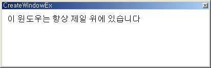 À©µµ¿ì¸¦ »ý¼ºÇÏ´Â ±â´ÉÀº CreateWindow ÇÔ¼ö¿Í µ¿ÀÏÇÏµÇ È®Àå ½ºÅ¸ÀÏÀ» ÁöÁ¤ÇÏ´Â dwExStyle ¸â¹ö°¡ ÀÖ´Ù´Â Á¡¸¸ ´Ù¸£´Ù. CreateWindow ÇÔ¼ö´Â dwExStyleÀÌ 0ÀÎ ¸ÅÅ©·Î ÇÔ¼ö·Î Á¤ÀǵǾî ÀÖ´Ù. ´ÙÀ½ ¿¹Á¦´Â Ç×»ó À§¿¡ ÀÖÀ¸¸ç Åø À©µµ¿ì ¸ð¾çÀÇ Å¸ÀÌÆ² ¹Ù¸¦ °¡Áø´Ù. Åø À©µµ¿ì´Â ŸÀÌÆ² ¹ÙÀÇ ³ôÀ̰¡ ³·À¸¸ç Ÿ½ºÅ© ¹Ù¿¡ ³ªÅ¸³ªÁö ¾Ê°í Alt+TabÀ¸·Î ÀÛ¾÷ ÀüȯÀ» ÇÒ ¼ö ¾ø´Ù. hWnd=CreateWindowEx(WS_EX_TOPMOST | WS_EX_TOOLWINDOW, lpszClass,lpszClass,WS_OVERLAPPEDWINDOW, CW_USEDEFAULT,CW_USEDEFAULT,CW_USEDEFAULT,CW_USEDEFAULT, NULL,(HMENU)NULL,hInstance,NULL);