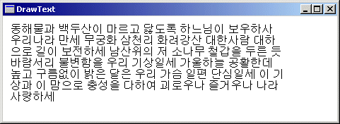 | ¿øÇü | int DrawText(HDC hDC, LPCTSTR lpString, int nCount, LPRECT lpRect, UINT uFormat); | ||||||||||||||||||||||||||||||||||||||||||||||||||