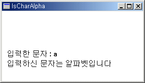 ƯÁ¤ ¹®ÀÚ°¡ ¾ËÆÄºªÀÎÁö Á¶»çÇÑ´Ù. ch°¡ a~z ¶Ç´Â A~Z»çÀÌÀÇ ¹®ÀÚ ÄÚµåÀ̸é TRUE¸¦ ¸®ÅÏÇÔÀ¸·Î½á ÀÌ ¹®ÀÚ°¡ ¾ËÆÄºªÀ̶ó´Â °ÍÀ» Á¶»çÇÑ´Ù. ¾î¶² ¹®ÀÚ°¡ ¾ËÆÄºªÀ» ±¸¼ºÇÏ´Â ¹®ÀÚÀΰ¡´Â Á¦¾îÆÇÀÇ ¾ð¾î ¼³Á¤¿¡ µû¶ó ´Þ¶óÁö³ª ÀϹÝÀûÀ¸·Î ´ë¼Ò¹®ÀÚ¿¡ »ó°ü¾øÀÌ AºÎÅÍ Z±îÁöÀÇ ¹®ÀÚ°¡ ¾ËÆÄºªÀÌ´Ù. ÇѱÛÀº ¾ËÆÄºªÀ¸·Î ÀÎÁ¤µÇÁö ¾Ê´Â´Ù. ÀÌ ÇÔ¼ö¸¦ »ç¿ëÇÏ´Â ´ë½Å chÀÇ Äڵ尪À» Á÷Á¢ Á¡°ËÇØ º¼ ¼öµµ ÀÖ´Ù. ´ÙÀ½ ¿¹Á¦´Â Űº¸µå·ÎºÎÅÍ ÀÔ·ÂµÈ ¹®ÀÚ°¡ ¾ËÆÄºª ¹®ÀÚÀÎÁö Á¶»çÇÏ¿© ±× °á°ú¸¦ ÀÛ¾÷ ¿µ¿µ¿¡ Ãâ·ÂÇØ ÁØ´Ù. ½ÇÇà ÈÄ Å°º¸µå·Î ¹®ÀÚ¸¸ ÀÔ·ÂÇϸé Áï½Ã °á°ú¸¦ º¼ ¼ö ÀÖ´Ù.