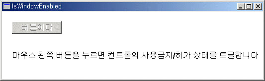 hWnd À©µµ¿ì°¡ »ç¿ë °¡´ÉÇÑ »óÅÂÀÎÁö Á¶»çÇÑ´Ù. »ç¿ë °¡´ÉÇÑ À©µµ¿ì¸¸ »ç¿ëÀڷκÎÅÍ ÀÔ·ÂÀ» ¹Þ¾ÆµéÀÏ ¼ö ÀÖ´Ù. ±×·¯³ª »ç¿ë ±ÝÁöµÈ À©µµ¿ìµµ ³»ºÎÀûÀÎ ¸Þ½ÃÁö´Â ó¸®ÇÑ´Ù. ¹öư, ¿¡µðÆ® µîÀÇ ÄÁÆ®·ÑÀÌ ÀÔ·ÂÀ» ¹ÞÀ» ¼ö ÀÖ´Â »óÅÂÀÎÁö¸¦ Á¶»çÇÒ ¶§ ÀÌ ÇÔ¼ö°¡ »ç¿ëµÈ´Ù. ´ÙÀ½ ¿¹Á¦´Â ¹öư ÄÁÆ®·ÑÀÇ »ç¿ë Çã°¡ »óŸ¦ Åä±Û½ÃŲ´Ù. ¹öưÀÌ »ç¿ë °¡´É »óÅÂÀÎÁö ±ÝÁö »óÅÂÀÎÁö¸¦ º°µµÀÇ Àü¿ª º¯¼ö¿¡ ÀúÀåÇÏÁö ¾Ê°í ÀÌ ÇÔ¼ö·Î ½Ç½Ã°£À¸·Î Á¶»çÇÏ¿´´Ù.