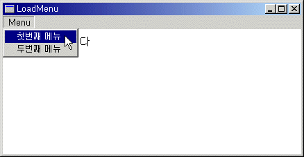 ¸Þ´º ¸®¼Ò½º¸¦ Àоî¿Â´Ù. ¸Þ´º´Â Åë»ó ¸®¼Ò½º·Î ÀÛ¼ºµÇ¸ç ¸µÅ©½Ã ½ÇÇà ÆÄÀÏ¿¡ ÇÕÃÄÁø´Ù. À©µµ¿ì¿¡ ¸Þ´º¸¦ ºÙÀÌ´Â ¹æ¹ýÀº ¿©·¯ °¡Áö°¡ Àִµ¥ °¡Àå ÈçÇÏ°Ô »ç¿ëµÇ´Â ¹æ¹ýÀº À©µµ¿ì Ŭ·¡½ºÀÇ lpszMenuName ¸â¹ö¿¡ »ç¿ëÇÒ ¸Þ´º ¸®¼Ò½º¸¦ ÁöÁ¤ÇØ ÁÖ´Â °ÍÀÌ´Ù. WndClass.lpszMenuName=MAKEINTRESOURCE(IDR_MENU1); lpszMenuName ¸â¹ö¿¡ ¸Þ´º ¸®¼Ò½º¸¦ ´ëÀÔÇØ ÁÖ¸é ÀÌÈĺÎÅÍ ÀÌ À©µµ¿ì Ŭ·¡½º·ÎºÎÅÍ »ý¼ºµÇ´Â ¸ðµç À©µµ¿ì´Â ÀÌ ¸Þ´º ¸®¼Ò½º¸¦ »ç¿ëÇÑ´Ù. µÎ¹øÂ° ¹æ¹ýÀº CreateWindowÀÇ hMenu ¸â¹ö¿¡ »ç¿ëÇÒ ¸Þ´º ÇÚµéÀ» ´ëÀÔÇØ ÁÖ´Â °ÍÀÌ´Ù. ¸¸¾à À©µµ¿ì Ŭ·¡½º¿¡µµ ¸Þ´º°¡ ÁöÁ¤µÇ¾î ÀÖ°í CreateWindow¿¡µµ ¸Þ´º ÇÚµéÀÌ ÁöÁ¤µÇ¾î ÀÖÀ¸¸é CreateWindowÀÇ ¸Þ´º ÁöÁ¤ÀÌ ¿ì¼±À̹ǷΠÀ©µµ¿ì Ŭ·¡½º¿¡ ÀÖ´Â ¸Þ´º ´ë½Å ´Ù¸¥ ¸Þ´º¸¦ »ç¿ëÇÏ·Á¸é CreateWindow¿¡ ¸Þ´º ÇÚµéÀ» ÁöÁ¤ÇÏ¸é µÈ´Ù. ÇÏÁö¸¸ Åë»óÀûÀ¸·Î ÇÑ À©µµ¿ì Ŭ·¡½º·ÎºÎÅÍ ÇϳªÀÇ ¸ÞÀÎ À©µµ¿ì¸¦ ¸¸µå¹Ç·Î ù¹øÂ° ¹æ¹ýÀÌ ÈξÀ ´õ ¸¹ÀÌ »ç¿ëµÈ´Ù. ¸Þ´º¸¦ »ç¿ëÇÏ´Â ¼¼¹øÂ° ¹æ¹ýÀº ½ÇÇàÁß¿¡ ¸Þ´º¸¦ Àоî¿Í À©µµ¿ì¿¡ ºÙÀÌ´Â °ÍÀ̸ç À̶§ LoadMenu ÇÔ¼ö°¡ »ç¿ëµÈ´Ù. LoadMenu·Î Àоî¿Â ¸Þ´º ÇÚµéÀ» SetMenu ÇÔ¼ö·Î À©µµ¿ì¿¡ ºÙ¿©ÁÖ¸é µÈ´Ù. ´Ü, À̶§ LoadMenu·Î ÀÐÀº ¸Þ´º ÇÚµéÀº ¹Ýµå½Ã DestroyMenu ÇÔ¼ö·Î ÇØÁ¦ÇØ ÁÖ¾î¾ß ÇÑ´Ù. ´ÙÀ½ ¿¹Á¦´Â ½ÇÇàÁß¿¡ ¸Þ´º ¸®¼Ò½º¸¦ Àоî¿Í ¸Þ´º¸¦ À©µµ¿ì¿¡ ºÙÀδÙ.