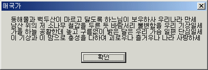 À§ ÄÚµå´Â ªÀº ¹®ÀÚ¿À» º¸¿©ÁØ´Ù. ¿©·¯ ÁÙÀÇ ±ä ¸Þ½ÃÁö¸¦ Ãâ·ÂÇÒ ¶§´Â ´ÙÀ½°ú °°ÀÌ ¹®ÀÚ¿ Áß°£¿¡ °³Çà Äڵ带 »ðÀÔÇØ ÁÖ¸é µÈ´Ù. MessageBox(hWnd, "µ¿Çع°°ú ¹éµÎ»êÀÌ ¸¶¸£°í ´âµµ·Ï ÇÏ´À´ÔÀÌ º¸¿ìÇÏ»ç ¿ì¸®³ª¶ó ¸¸¼¼\r\n" "³²»ê À§ÀÇ Àú ¼Ò³ª¹« ö°©À» µÎ¸¥ µí ¹Ù¶÷¼¸® ºÒº¯ÇÔÀ» ¿ì¸® ±â»óÀϼ¼\r\n" "°¡À» ÇÏ´Ã °øÈ°Çѵ¥ ³ô°í ±¸¸§¾øÀÌ ¹àÀº ´ÞÀº ¿ì¸® °¡½¿ ÀÏÆí ´Ü½ÉÀϼ¼\r\n" "ÀÌ ±â»ó°ú ÀÌ ¸¾À¸·Î Ãæ¼ºÀ» ´ÙÇÏ¿© ±«·Î¿ì³ª Áñ°Å¿ì³ª ³ª¶ó »ç¶ûÇϼ¼", "¾Ö±¹°¡",MB_OK);