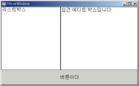 À©µµ¿ìÀÇ À§Ä¡¿Í Å©±â¸¦ º¯°æÇÏ´Â °¡Àå ÀϹÝÀûÀÎ ÇÔ¼öÀÌ´Ù. X,Y Àμö·Î À©µµ¿ìÀÇ À§Ä¡¸¦ ÁöÁ¤Çϸç nWidth, nHeight Àμö·Î À©µµ¿ìÀÇ Æø°ú ³ôÀ̸¦ ÁöÁ¤ÇϹǷΠÀÌ ÇÔ¼ö·Î À§Ä¡¿Í Å©±â¸¦ ÇѲ¨¹ø¿¡ º¯°æÇÒ ¼ö ÀÖ´Ù. ´Ü À§Ä¡¸¸ º¯°æÇϰųª Å©±â¸¸ º¯°æÇϰíÀÚ ÇÒ °æ¿ì´Â GetWindowRect µîÀÇ ÇÔ¼ö·Î ¿µ¿ªÀ» ¸ÕÀú ±¸ÇÑ ÈÄ ¿øÇÏ´Â °ª¸¸ º¯°æÇϰųª ¾Æ´Ï¸é SetWindowPos ÇÔ¼ö¸¦ »ç¿ëÇØ¾ß ÇÑ´Ù. ÀÌ ÇÔ¼ö´Â ÀϹÝÀûÀ¸·Î ºÎ¸ð À©µµ¿ì³»¿¡¼ Â÷Àϵå ÄÁÆ®·ÑÀ» Á¤·ÄÇϱâ À§ÇÑ ¿ëµµ·Î ¸¹ÀÌ »ç¿ëÇϸç ÃÖ»óÀ§ À©µµ¿ìÀÇ Å©±â³ª À§Ä¡¸¦ º¯°æÇÒ ¶§´Â ÀÌ ÇÔ¼ö ´ë½Å SetWindowPos ÇÔ¼ö¸¦ »ç¿ëÇÏ´Â °ÍÀÌ ¹Ù¶÷Á÷ÇÏ´Ù. ´ÙÀ½ ¿¹Á¦´Â ºÎ¸ð À©µµ¿ìÀÇ ÀÛ¾÷¿ª¿¡ ¹öư, ¿¡µðÆ®, ¸®½ºÆ® ¹Ú½º¸¦ °¢°¢ ¹èÄ¡Çϰí ÀÌ ÄÁÆ®·ÑµéÀ» ÀÛ¾÷¿µ¿ªÀÇ Æ¯Á¤ÇÑ À§Ä¡¿¡ Á¤·ÄÇÏ´Â ¿¹¸¦ º¸¿©ÁØ´Ù.