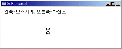 ¿ÞÂÊ ¹öưÀ» ´·¶À» ¶§ 3Ãʰ£ÀÇ ÀÛ¾÷À» Çϴµ¥ ÀÛ¾÷¿¡ µé¾î°¡±â Àü¿¡ SetCursor ÇÔ¼ö·Î Ä¿¼¸¦ IDC_WAIT·Î º¯°æÇØ ÁÖ¾ú´Ù. ¸®¼Ò½º¿¡ Á¤ÀǵǾî ÀÖ´Â Ä¿½ºÅÒ Ä¿¼¸¦ »ç¿ëÇÏ´Â °Íµµ ¹°·Ð °¡´ÉÇÏ´Ù. ÀÌ ÇÔ¼ö°¡ ¸®ÅÏÇØ ÁÖ´Â ÀÌÀü Ä¿¼ ÇÚµéÀ» hOld¿¡ º¸°üÇØ ³õÀº ÈÄ ÀÛ¾÷ÀÌ ³¡³ª¸é ¿ø·¡ÀÇ Ä¿¼·Î º¹±¸½ÃÄ×´Ù. ½Ã°£ÀÌ ¿À·¡ °É¸®´Â ÀÛ¾÷À» ÇÒ ¶§´Â ÀÌ·± Ä¿¼ º¯°æ Äڵ带 ¹Ýµå½Ã »ðÀÔÇÏ¿© ÀÛ¾÷ÁßÀÓÀ» ¾Ë·ÁÁÖ¾î¾ß ÇÑ´Ù. ´ÙÀ½ ¿¹Á¦´Â ¸¶¿ì½ºÀÇ ¿ÞÂÊ ¹öưÀ» ´©¸£¸é ¸ð·¡½Ã°è ¸ð¾çÀÇ Ä¿¼¸¦ º¸¿©ÁÖ°í ¿À¸¥ÂÊ ¹öưÀ» ´©¸£¸é È»ìÇ¥ ¸ð¾çÀÇ Ä¿¼¸¦ º¸¿©ÁØ´Ù. ÀÏÁ¤ÇÑ Á¶°Ç¿¡ µû¶ó Ä¿¼ÀÇ ¸ð¾çÀ» º¯°æÇÏ´Â ¿¹Á¦ÀÌ´Ù.