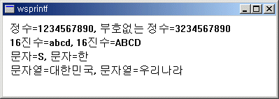 Á¤¼öÇü°ú 16Áø Á¤¼ö, ¹®ÀÚ, ¹®ÀÚ¿¿¡ ´ëÇØ ¼½ÄÀ» Àû¿ëÇØ º¸¾Ò´Ù. wsprintf´Â À¯´ÏÄڵ带 Áö¿øÇϹǷΠ¼½Ä¹®ÀÚ¿À» ÀÛ¼ºÇÒ ¶§µµ TEXT ¸ÅÅ©·Î¸¦ »ç¿ëÇÏ´Â °ÍÀÌ ÁÁ´Ù.