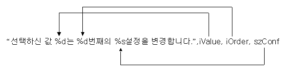 wsprintf´Â À¯´ÏÄڵ带 Áö¿øÇϸç UNICODE ¸ÅÅ©·ÎÀÇ Á¤ÀÇ ¿©ºÎ¿¡ µû¶ó ¼½Ä°ú ´ëÀÀµÇ´Â º¯¼öÀÇ Æ÷¸ËÀÌ ´Þ¶óÁú ¼ö ÀÖ´Ù. lpFmt Àμö ´ÙÀ½¿¡´Â ¼½Ä¿¡ ´ëÀÀµÇ´Â º¯¼ö°¡ ¿À¸ç ÀÌ º¯¼öµéÀº lpFmt¿¡¼ ³ªÅ¸³ª´Â ¼½Ä°ú ¼ø¼´ë·Î ÀÏ´ëÀÏ ´ëÀÀµÈ´Ù. ¿¹¸¦ µé¾î ´ÙÀ½°ú °°ÀÌ ÀÌ ÇÔ¼ö¸¦ È£ÃâÇß´Ù°í ÇÏÀÚ. wsprintf(lpOut, "¼±ÅÃÇϽаª %d´Â %d¹øÂ°ÀÇ %s¼³Á¤À» º¯°æÇÕ´Ï´Ù.",iValue, iOrder, szConf); ù¹øÂ° %d´Â ¼¼¹øÂ° º¯¼ö iValue¸¦ ¹ÞÀ¸¸ç µÎ¹øÂ° %d´Â ´Ù¼¸¹øÂ° º¯¼ö iOrder°ªÀ» ¹ÞÀ¸¸ç %s´Â ¸¶Áö¸· Àμö szConf¸¦ ¹Þ´Â´Ù. ¼½Ä ¹®ÀÚ¿¿¡ ³ªÅ¸³ª´Â ¼½ÄÀÇ °³¼ö¿Í ȣȯµÇ´Â ŸÀÔÀÇ º¯¼ö°¡ ¹Ýµå½Ã Á¦°øµÇ¾î¾ß ÇÑ´Ù.