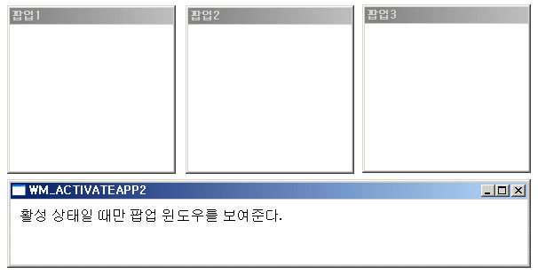 ºÎ¸ð À©µµ¿ìÀÇ È°¼ºÈ »óŰ¡ º¯°æµÉ ¶§¸¶´Ù WM_ACTIVATEAPP ¸Þ½ÃÁö°¡ Àü´ÞµÇ¹Ç·Î ÀÌ ¸Þ½ÃÁö¿¡¼ ÆË¾÷ À©µµ¿ì¸¦ ¼û±â°Å³ª º¸À̵µ·Ï ÇÏ¿´´Ù. ¸¹Àº ÆË¾÷ À©µµ¿ì¸¦ °Å´À¸®°í ÀÖ´Â ÀÀ¿ë ÇÁ·Î±×·¥Àº ÀÚ½ÅÀÌ »ç¿ëµÇÁö ¾ÊÀ» ¶§ ÆË¾÷ À©µµ¿ì¸¦ ¼û±â°Å³ª ÃÖ¼ÒÈÇÏ¿© ´Ù¸¥ ÀÀ¿ë ÇÁ·Î±×·¥ÀÌ È¸é ¿µ¿ªÀ» ¸¹ÀÌ »ç¿ëÇÒ ¼ö ÀÖµµ·Ï ¾çº¸ÇØ ÁÖ¾î¾ß ÇÑ´Ù.