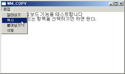 ´ÙÀ½ ¿¹Á¦´Â ¿¡µðÆ®¸¦ Çϳª ¸¸µé°í ¸ÞÀÎ ¸Þ´º¸¦ ÅëÇØ ¿¡µðÆ®ÀÇ Å¬¸³º¸µå ¾×¼ÇÀ» »ç¿ëÇÑ´Ù. Ŭ¸³º¸µå °ü·Ã ¸Þ½ÃÁö¸¦ SendMessage ÇÔ¼ö·Î ¿¡µðÆ® ÄÁÆ®·Ñ¿¡°Ô º¸³» Áֱ⸸ ÇÏ¸é µÈ´Ù.