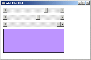¼¼ °³ÀÇ ¼öÆò ½ºÅ©·Ñ ¹Ù ÄÁÆ®·ÑÀ» ¸¸µé¾úÀ¸¸ç °¢ ÄÁÆ®·ÑÀÌ º¸³»´Â WM_HSCROLL ¸Þ½ÃÁö¿¡¼ R,G,B»ö»ó ¿ä¼Ò°ªÀ» º¯°æÇÏ¿© ÀÌ »ö»óÀ¸·Î »ç°¢ÇüÀ» ±×·ÁÁØ´Ù.