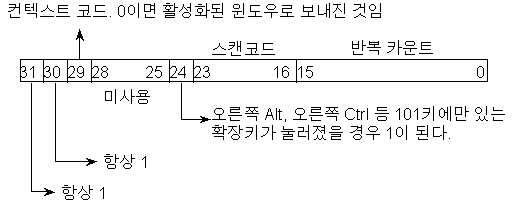 wParam : ³õÀÌÁø ŰÀÇ °¡»ó Ű ÄÚµå lParam : Űº¸µåÀÇ »óÅ¿¡ ´ëÇÑ ¿©·¯ °¡Áö Á¤º¸°¡ ºñÆ®º°·Î Àü´ÞµÈ´Ù.